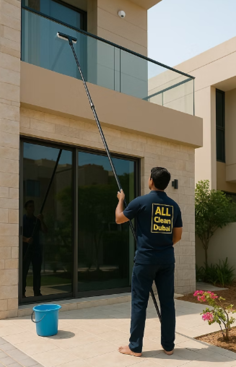 Reaching High Areas with Window Cleaning Dubai ToolsOne of the biggest challenges for villa owners is reaching second-story windows. Climbing ladders is dangerous and should be left to the professionals. We use telescopic poles that can extend up to 5 meters in length. This allows us to clean high windows safely from the ground level.